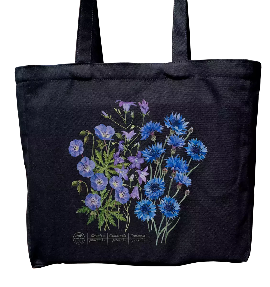 Unikalny, precyzyjnie nadrukowany wzór "Błękitna Łąka" przedstawia urokliwe polne kwiaty: bodziszek łąkowy, dzwonek rozpierzchły oraz chaber bławatek. Ten botaniczny motyw dodaje torbie niepowtarzalnego charakteru, sprawiając, że jest ona zarówno praktycznym dodatkiem, jak i wyrazem miłości do natury.