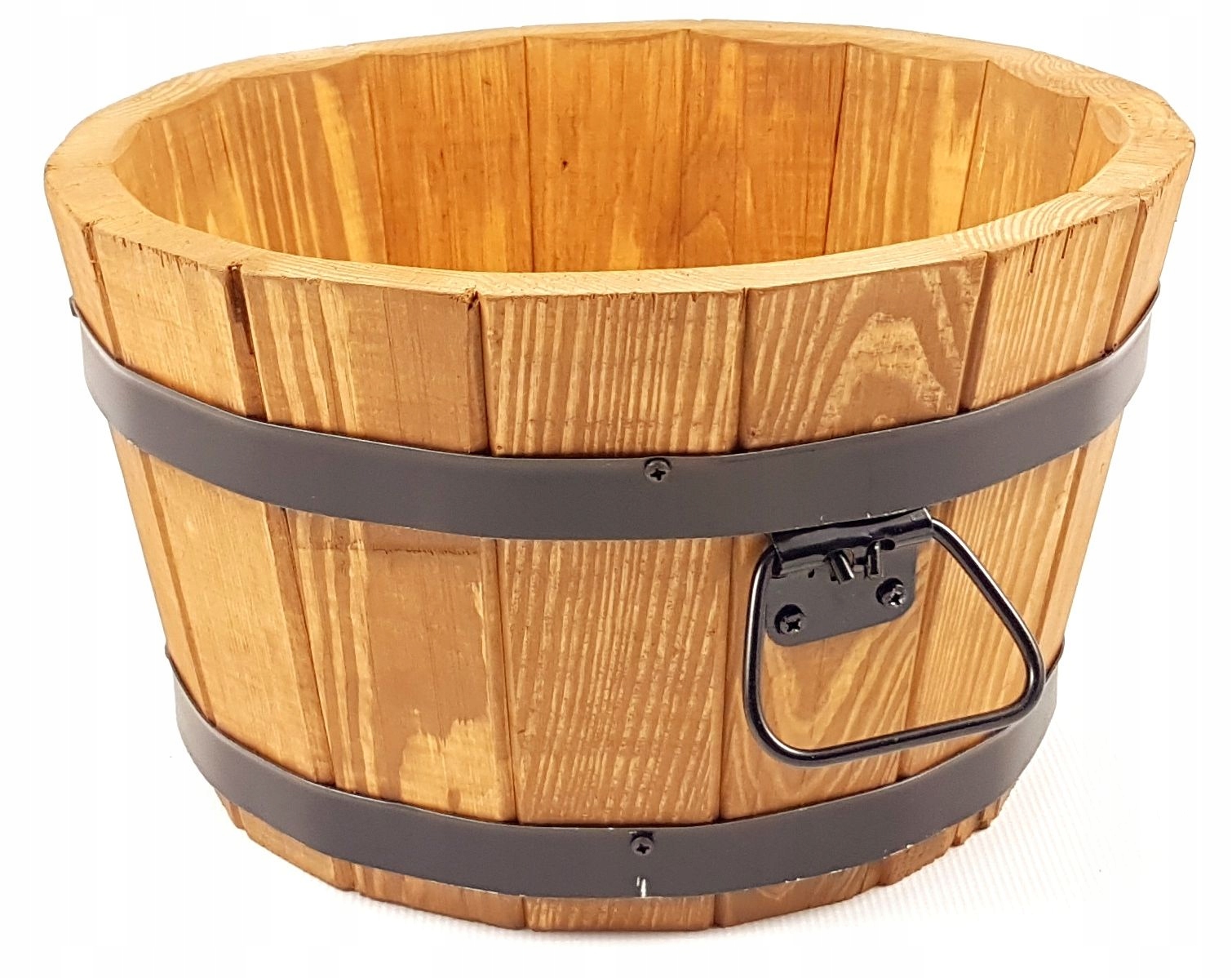 Donica posiada otwór drenażowy w grubym dnie z drewna sosnowego.