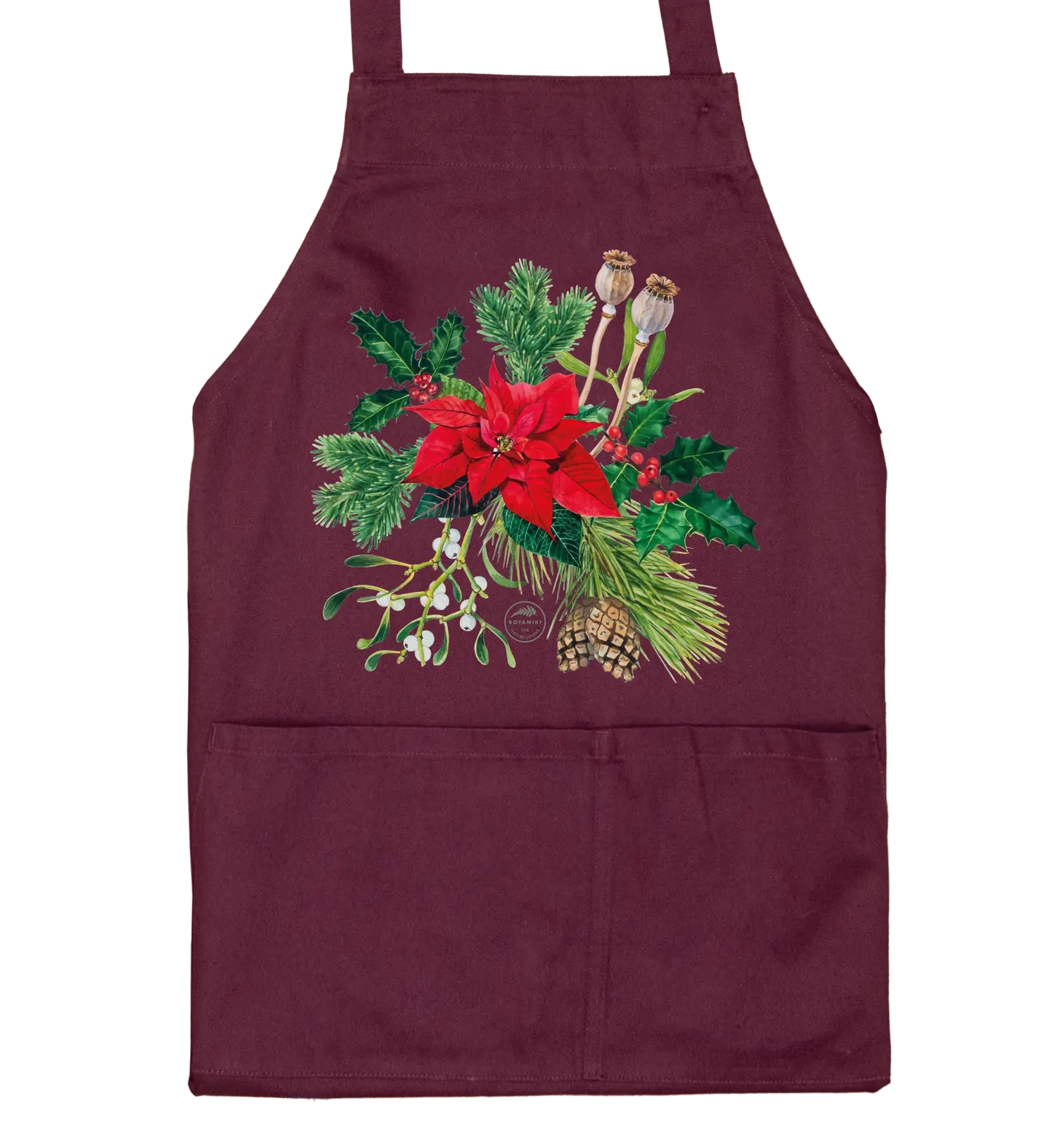 Fartuch ogrodowy Zimowy bukiet: Wilczomlecz, mak lekarski, jodła pospolita, sosna zwyczajna, ostrokrzew