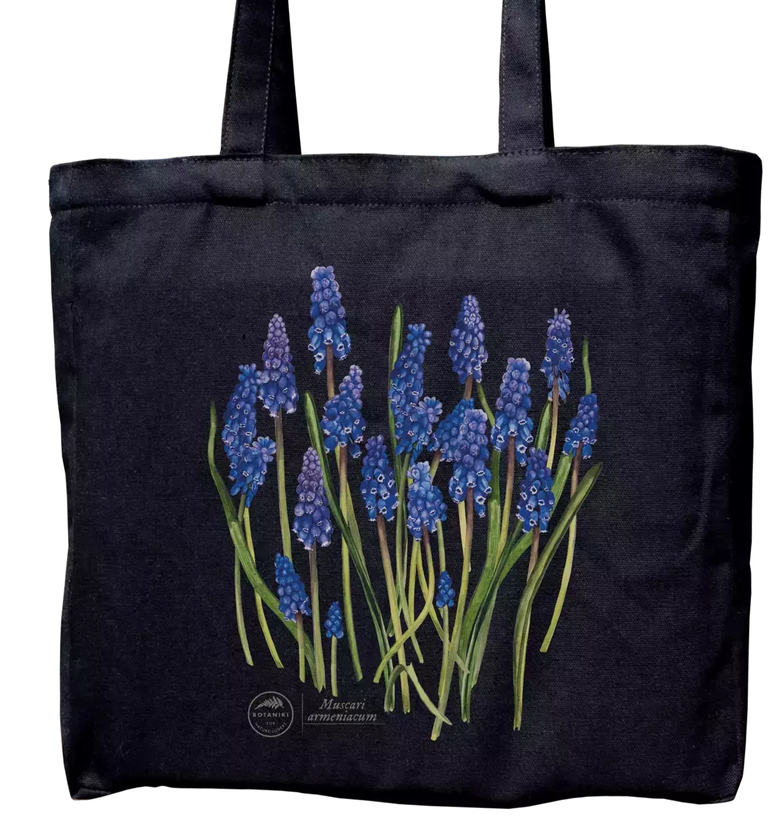 Unikalna, precyzyjnie nadrukowana ilustracja szafirka armeńskiego dodaje torbie niepowtarzalnego charakteru. Ten motyw, z jego drobnymi, intensywnie niebieskimi kwiatostanami, symbolizuje wiosnę i świeżość, czyniąc torbę nie tylko praktycznym dodatkiem, ale również stylowym akcentem.