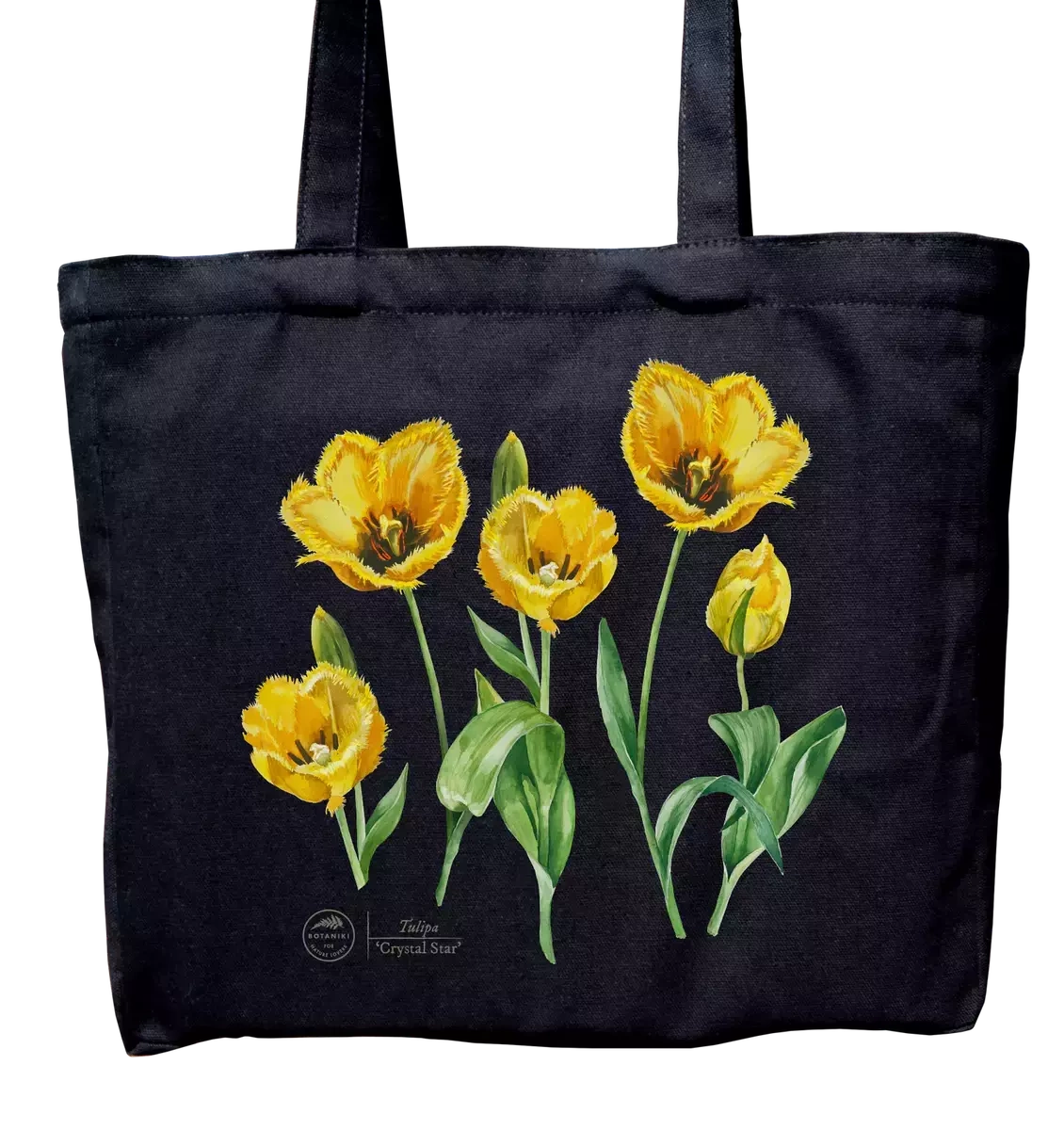 Unikalna, precyzyjnie nadrukowana ilustracja tulipana 'Crystal Star' dodaje torbie niepowtarzalnego charakteru. Ten motyw, z jego jaskrawymi, postrzępionymi płatkami w odcieniach żółci, symbolizuje wiosnę i radość, czyniąc torbę nie tylko praktycznym dodatkiem, ale również stylowym akcentem.