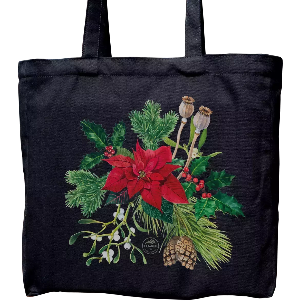 Unikalna, precyzyjnie nadrukowana ilustracja zimowego bukietu, składającego się z Wilczomlecza, Maka Lekarskiego, Jodły Pospolitej, Sosny Zwyczajnej i Ostrokrzewu, dodaje torbie niepowtarzalnego charakteru. Ten motyw, przedstawiający bogactwo zimowej flory, podkreśla związek z naturą i artystyczną kompozycją, czyniąc torbę nie tylko praktycznym dodatkiem, ale również stylowym akcentem.