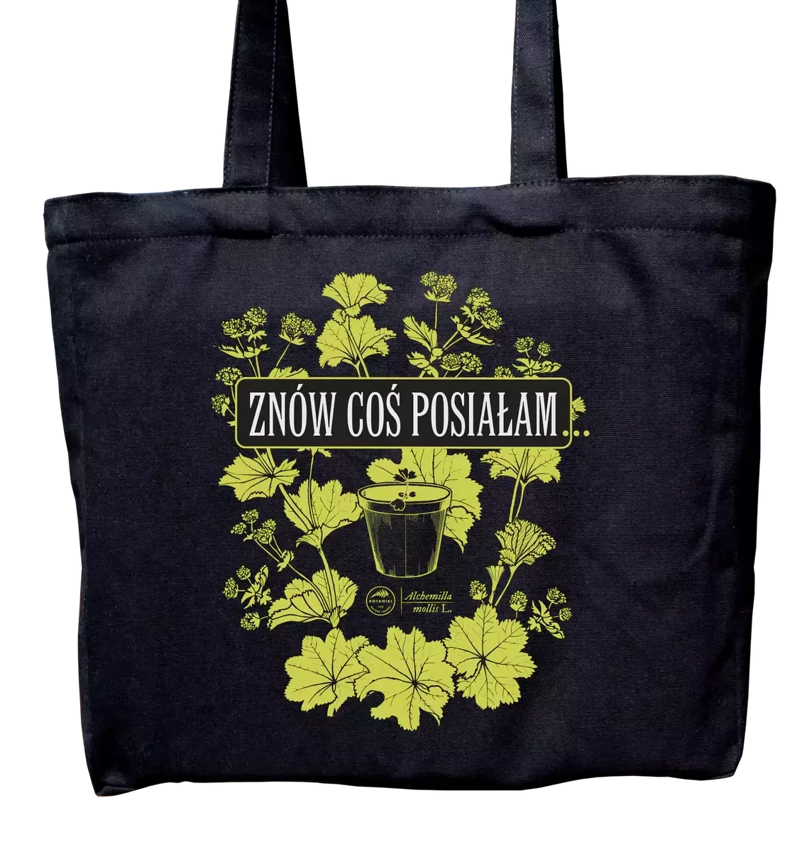 - Wyraźny nadruk: ilustracja Doniczki oraz napis "Znów coś posiałam"